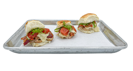 3 Hawaiian Sweet Slider Buns, Sliced Turkey, Sweet and Spicy Bacon, Mornay Sauce, Roasted Tomatoes & Scallions