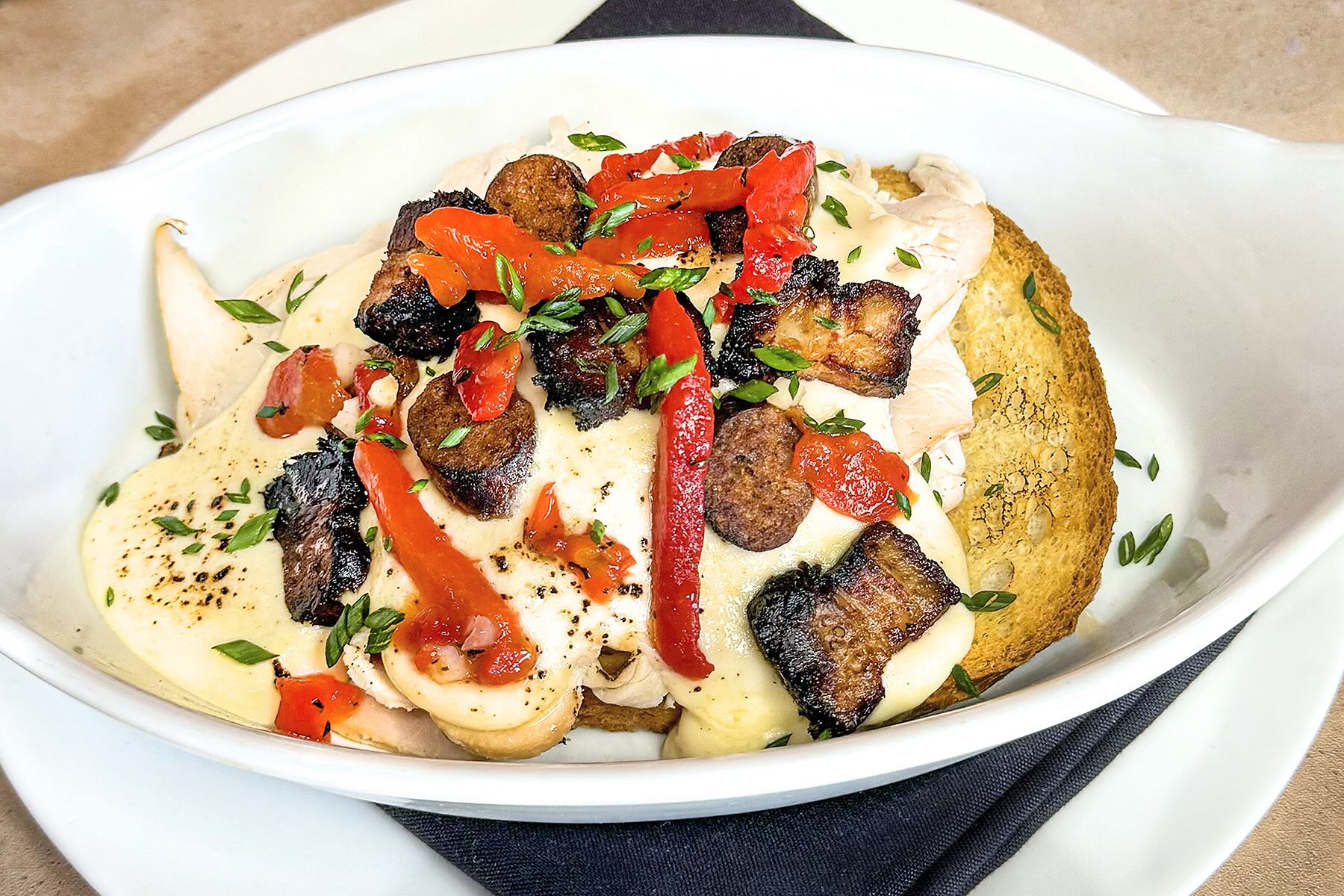 Open Face Brioche Toast, Roasted Turkey Breast, Gruyere Cheese Mornay Sauce, Merguez Sausage & Pork Belly, Roasted Red Peppers, Chives