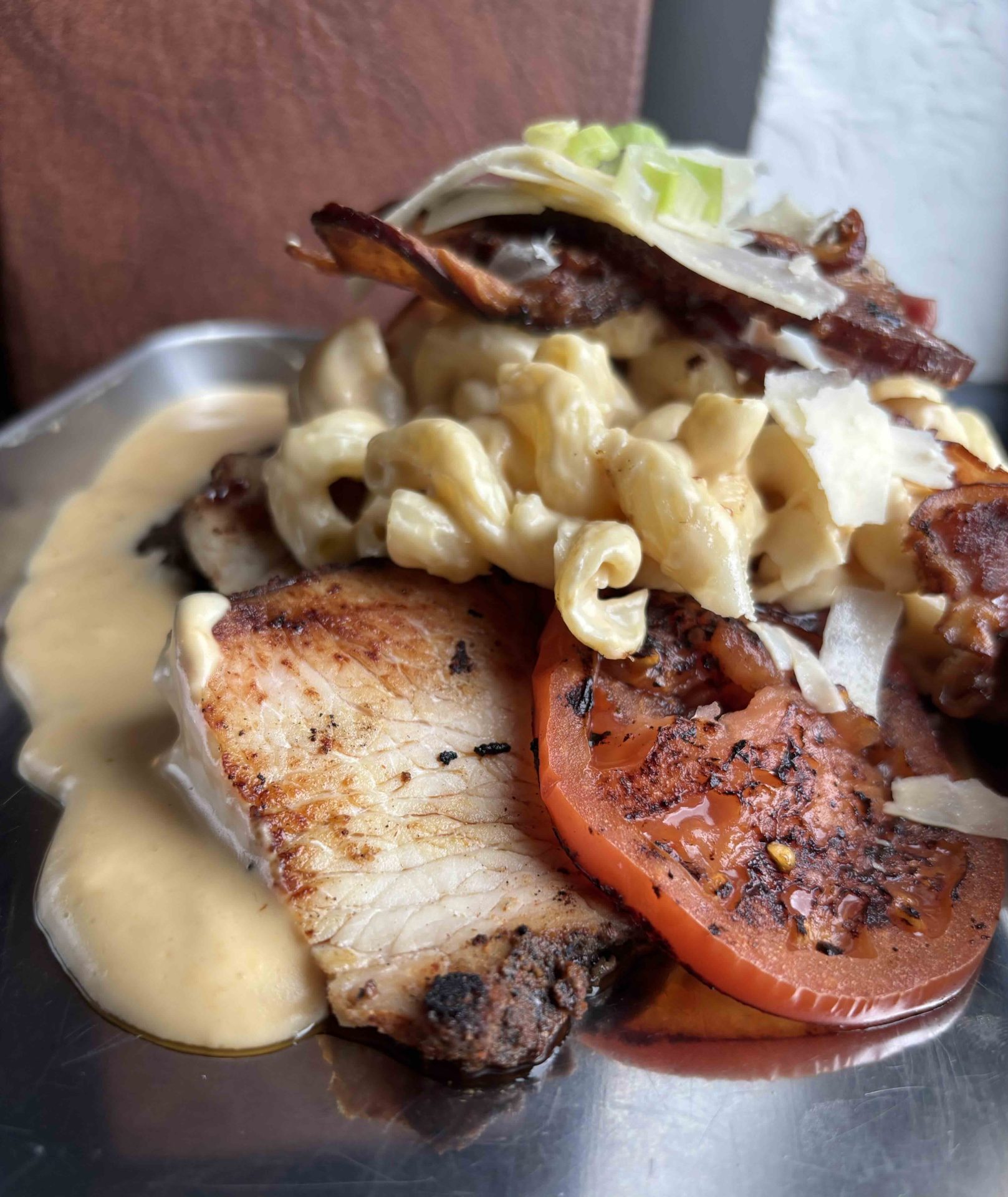 Cavatappi noodles with mornay sauce, tender smoked turkey, tomatoes, thick cut pepper bacon and green onions