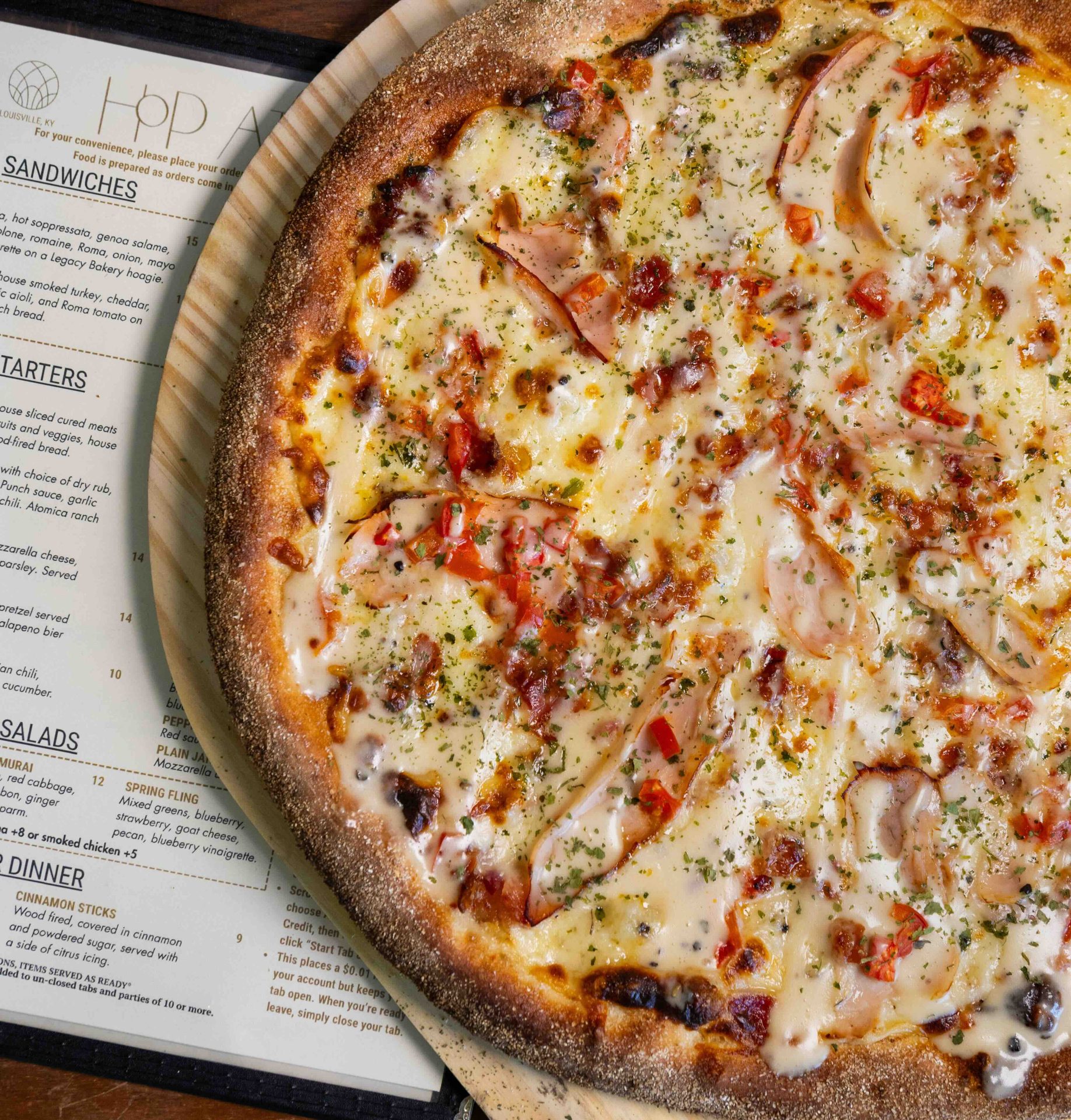 Atomica Mornay Sauce, Dry Rubbed and House Smoked Turkey Breast, diced Roma Tomato, Bacon crumble and Mozzarella cheese.